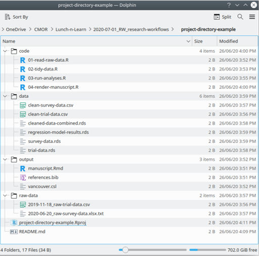 Shows in what order to run the scripts, and allows us to resume from the middle (if, for example, you have only changed the file 02-create-histogram.R, there is no need to redo the first two steps, but we do need to rerun the create-histogram and render-report steps