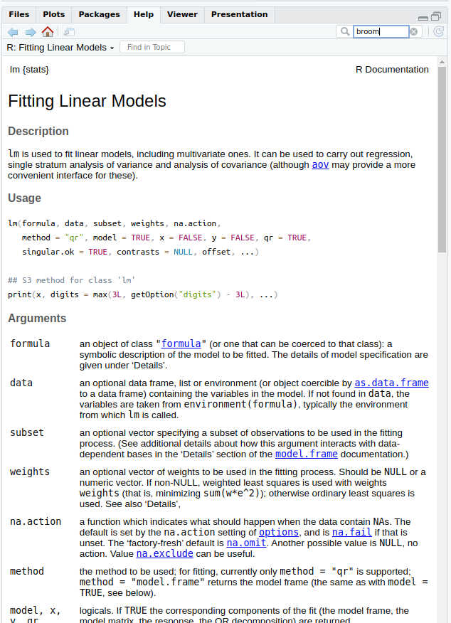 6 continentOceania      1.37 0.0282           11.3 1.57e- 28     1.30      1.45There are many (many!) other packages that estimate different regression models or provide tools for diagnostic testing, post-hoc analysis, or visualisation of regression models